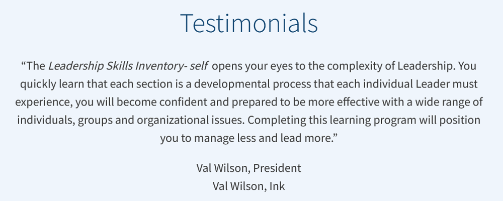Use the Self and Others versions of the Leadership Skills Inventory together for a 360° view of the leader’s skills. The information these tools provide will enhance the development of truly effective, motivating leaders.