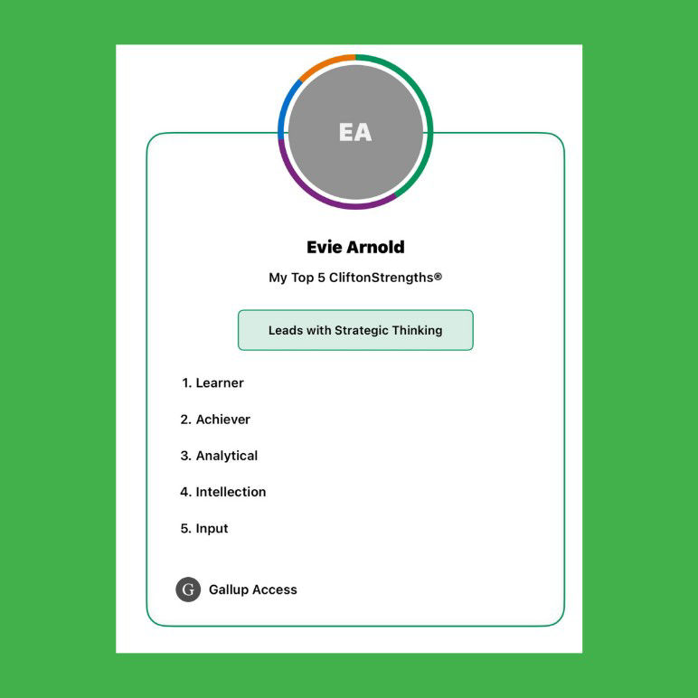 By identifying an individual’s top talent themes - natural patterns of thinking, feeling, and behaving – CliftonStrengths® creates a language for self-awareness, intentionality, and direction. In other words, it helps people build lives and careers that make sense for who they are at their core.