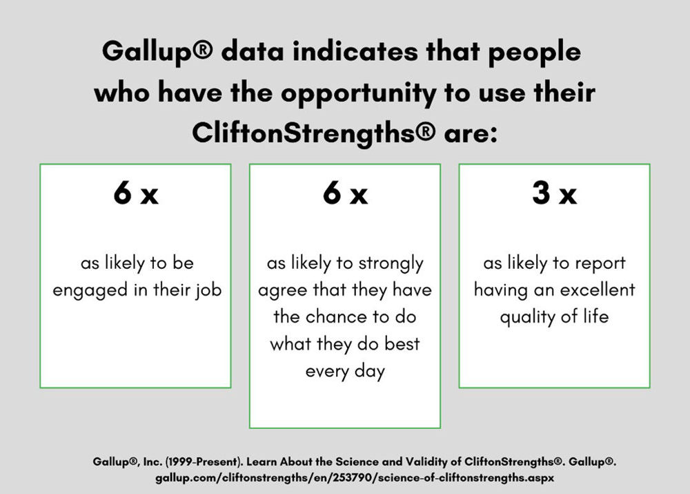 In fact, Gallup research shows that people who use their strengths every day are 6x more likely to be engaged at work and 3x more likely to report an excellent quality of life overall.